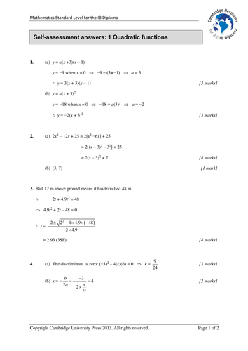 Cambridge Ib Maths Sl 1 Quadratic Functions Assess Teaching Resources